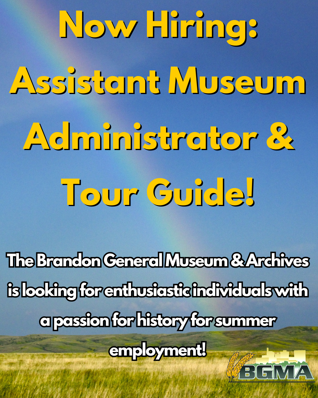 Are you passionate about history and the city of Brandon? The Brandon General Museum and Archives is now hiring two positions: an Assistant Museum Administrator and a Tour Guide both for a 9-week basis starting mid to late June to assist the Executive Director and BGMA Volunteers.